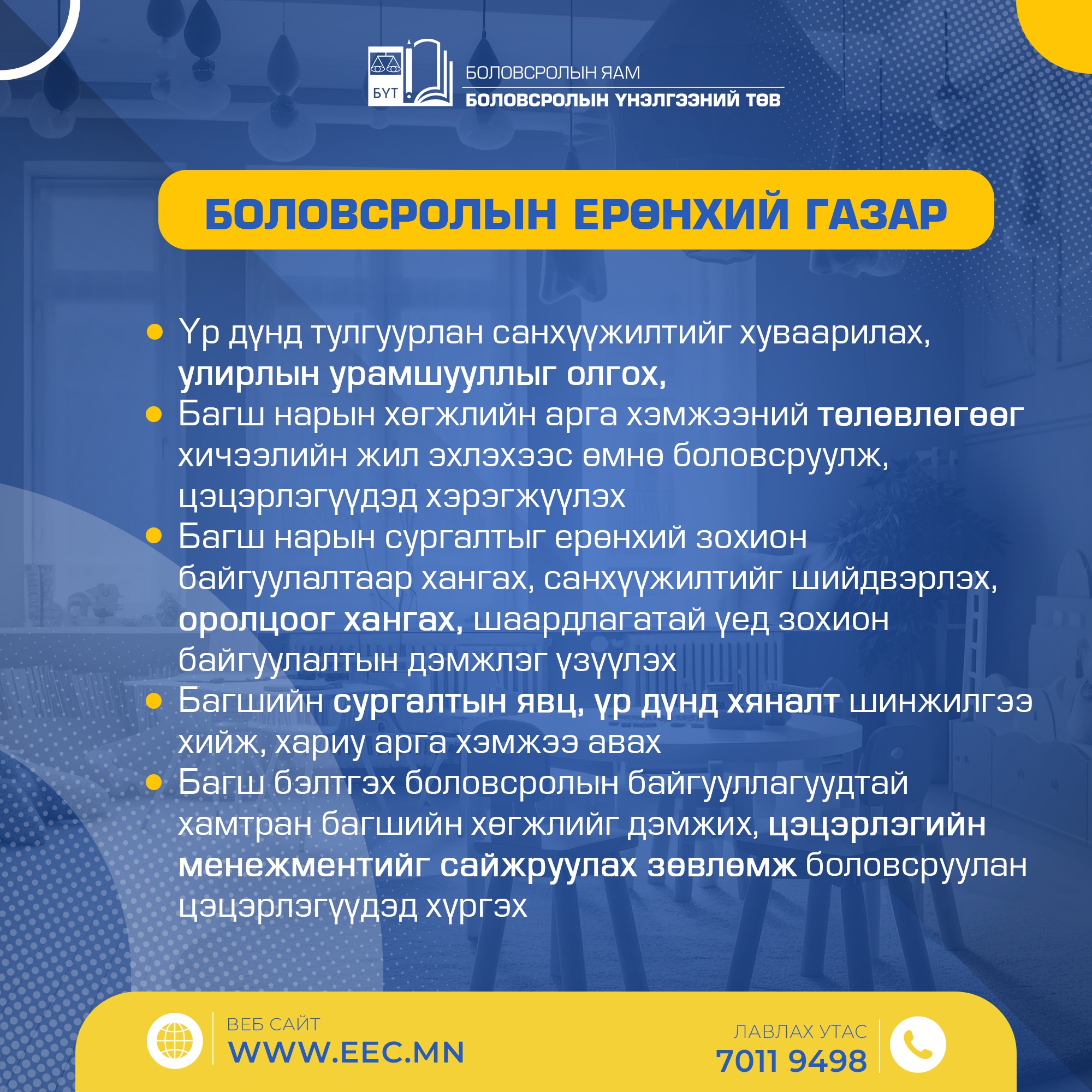 •Багшийн сургалтын явц, үр дүнд хяналт шинжилгээ хийж, хариу арга хэмжээ авах;