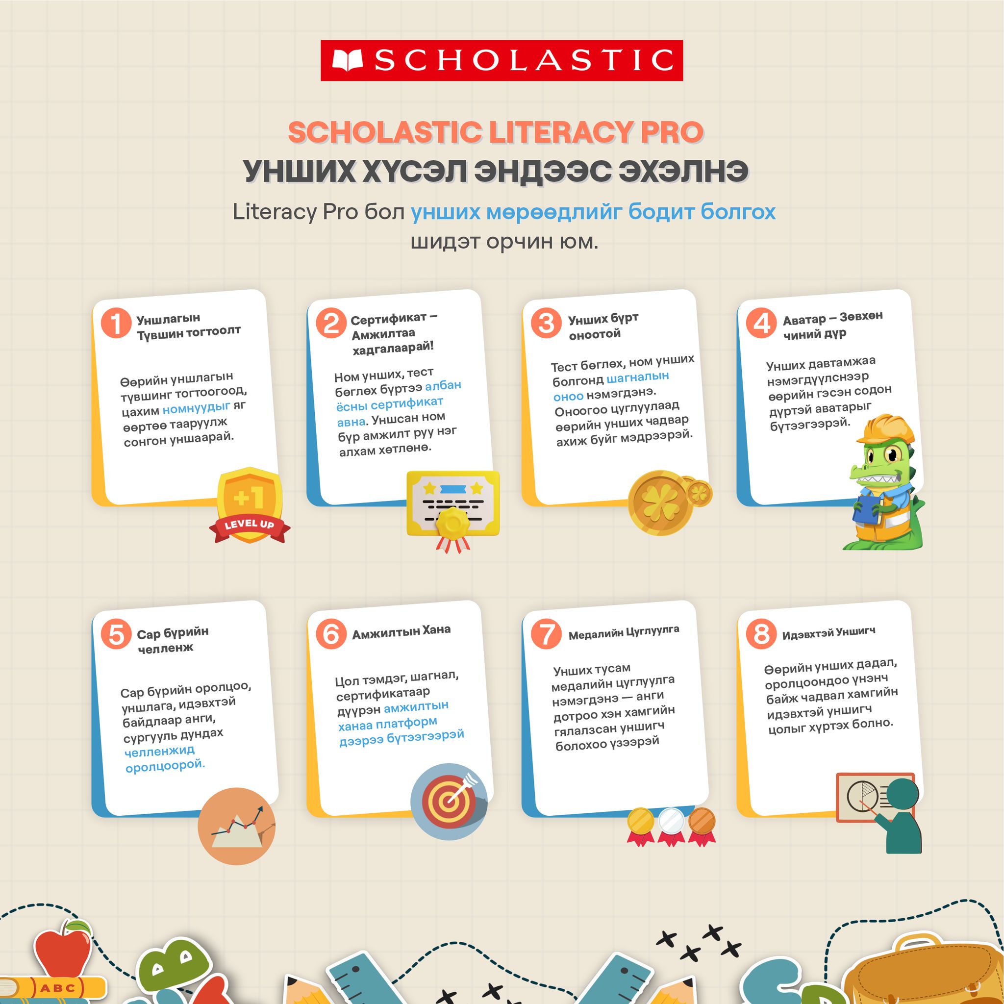 Үгийн баялаг, дүрмийн мэдлэг, хэлний чадвараа сонирхолтой, адал явдалтай аргаар ахиулах боломжтой, 3,000 гаруй цахим номтой Scholastic Literacy Pro платформыг сонгон уншаарай.