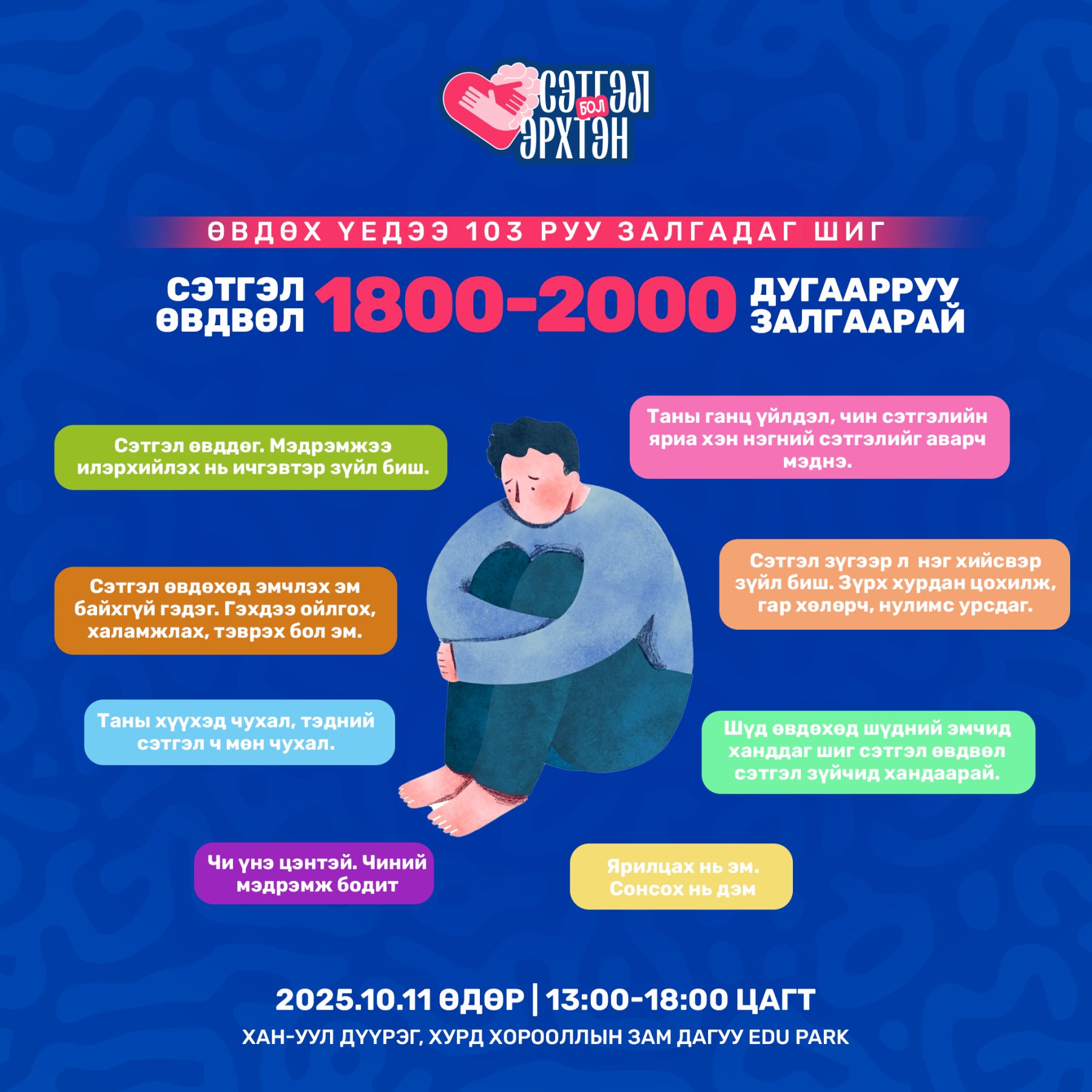 “Сэтгэл ч бас өвддөг, анзаараарай” уриатай “СЭТГЭЛ БОЛ ЭРХТЭН” нөлөөллийн ажлын хүрээнд 10-19 насны өсвөр үе, залууст зориулсан сэтгэлзүйн тусламж, дэмжлэг авах боломжийг нэмэгдүүлэх “Сэтгэлээ чагнах” өдөр арга хэмжээнд хүрэлцэн ирэхийг урья.