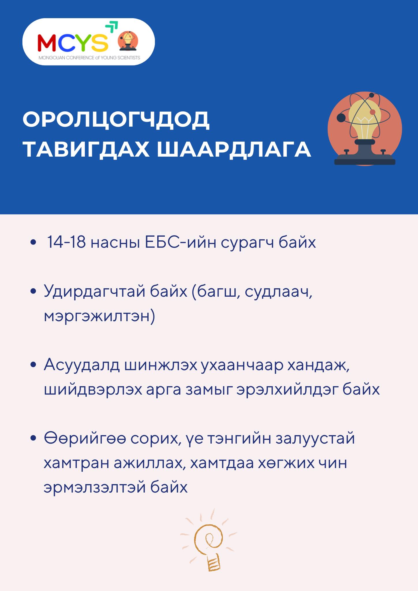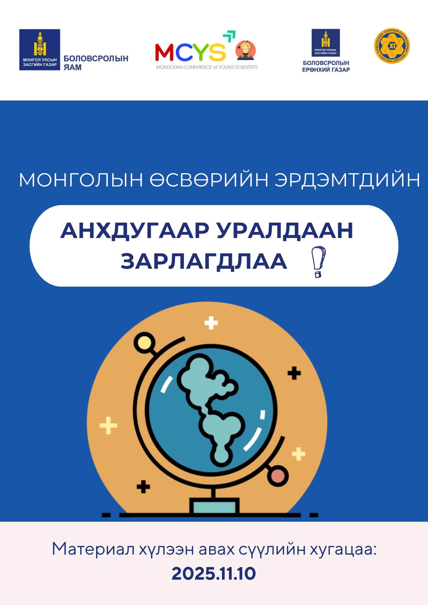 Монголын Өсвөрийн Эрдэмтдийн Анхдугаар Уралдааны сүүлийн давааны шалгаруулалтаар сурагчдыг байр эзлүүлж урамшуулахаас гадна “ICYS 2026” олон улсын уралдаанд Монгол улсаа төлөөлөн оролцох 6 сурагчийг сонгон шалгаруулах юм.